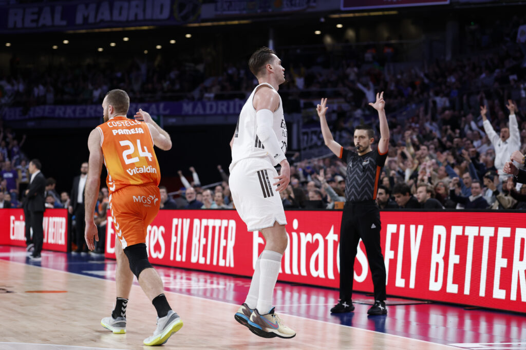 Montero inauguraba la contienda con un triple tras robo de balón, lo que daba a entender la intensidad que iba a aplicar Valencia Basket durante los 40′. Y es que los taronjas arrancaban arrollando: un parcial de 2-9 con dos triples de Reuvers les daba las primeras ventajas. El Real Madrid movía bien el balón en ataque pero, al contrario que en el clásico, no les entraban los tiros. Pese a ello, se mantenían en el partido gracias a su gran defensa y a la calidad individual de sus jugadores.