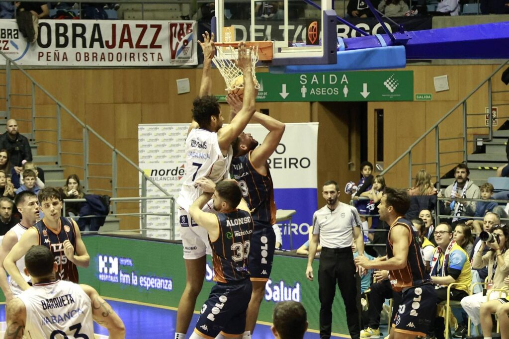 Los pivots burgaleses Vila y Brown se peleaban en la zona ante Dos Anjos y Kravic, pero sus buenos porcentajes de dos no llegaban para acortar un marcador que ya parecía imposible para los visitantes. De hecho Jordi Juste gastaba todos sus tiempos muertos y rotaba mucho el banquillo, a veces creo que demasiado, para poder generar quintetos eléctricos que tuvieran anotaciones rápidas, pero se agarraban mucho al triple que sólo les entró en la segunda parte (9/29), con buenos números de Jackson, Zidek o Huelves, pero que ya no eran suficientes para un Obradoiro que dominaba el encuentro y que con Barrueta, Galán, Barcello o Westermann mantenía un alto ritmo anotador que no dejaba al Tizona acercarse en absoluto.