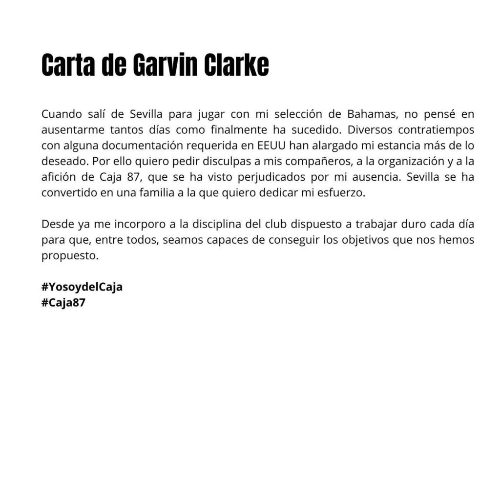 Una de las noticias positivas de cara al choque fue la llegada a principios de semana del bahameño Garvin Clarke. Tras el comunicado oficial que emitió el club en base a la situación del jugador cajista, se explicaba que el jugador comunicó que aprovechaba su estancia en EE. UU tras finalizar sus compromisos internacionales para “resolver determinados trámites burocráticos personales”. Esto le impidió reincorporarse a la disciplina cajista y el club explicaba lo siguiente: