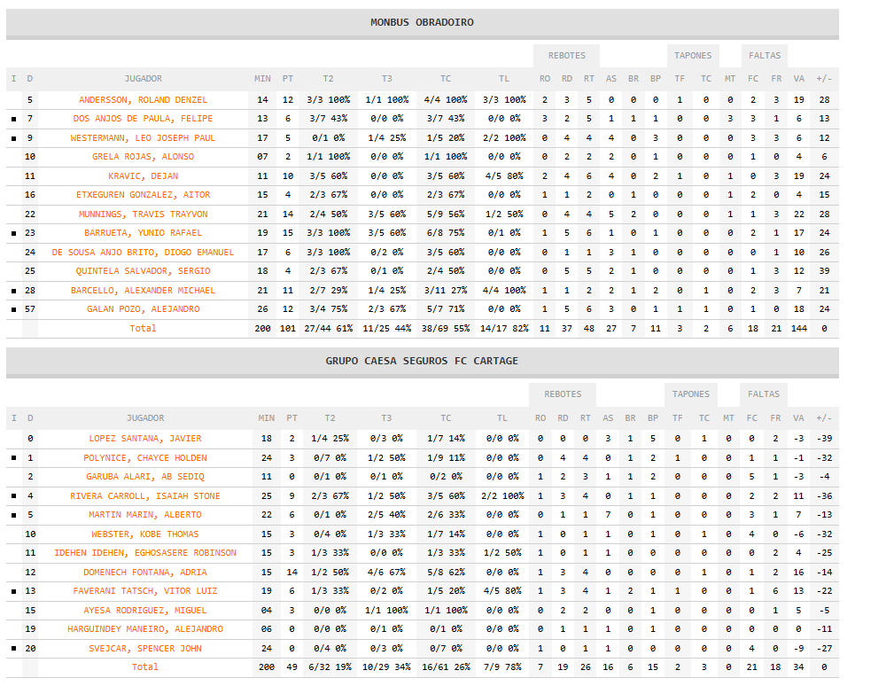 En fin, partido mucho más fácil de lo pensado en principio, solo con echar un ojo a las estadísticas las diferencias son abrumadoras en todos los aspectos (rebotes, porcentajes, asistencias; valoración), que no resisten ya el más mínimo análisis. Cartagena tiene que trabajar y mejorar mucho para salvar la categoría.